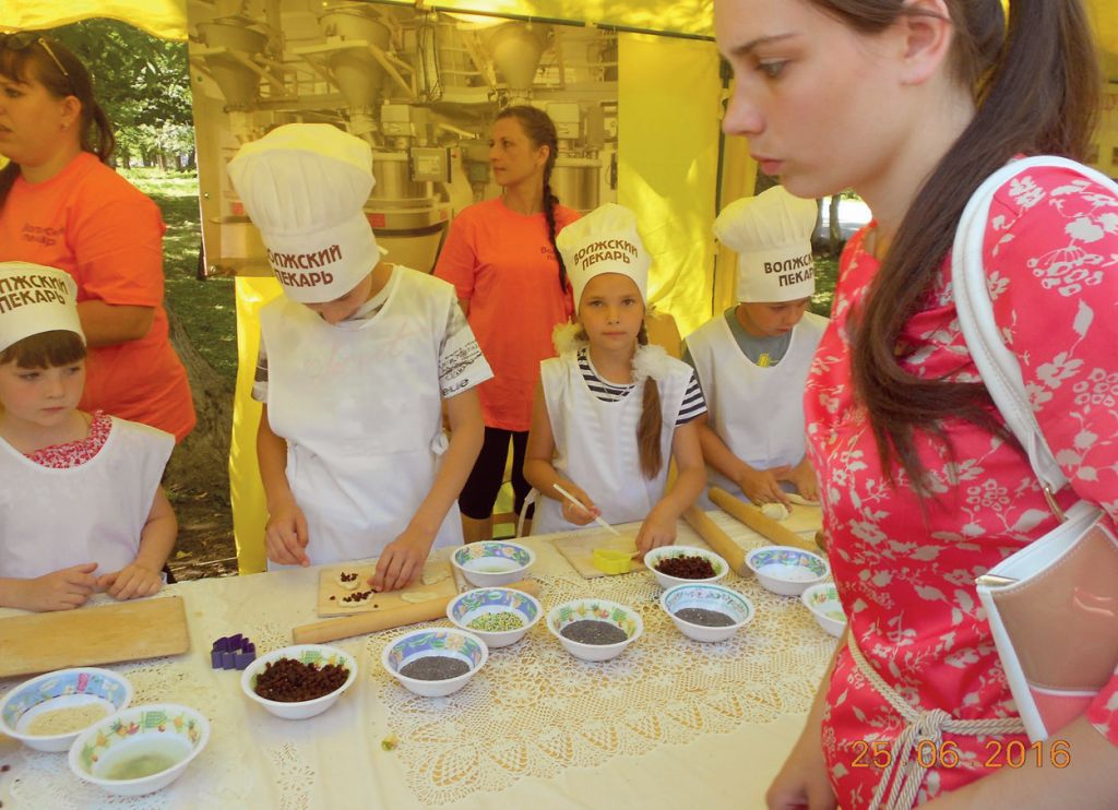 Что же предложило ржевитянам предприятие из областного центра? Было установлено несколько напротив ТЦ "Люкс". В первом было кафе, где предлагалось отведать продукцию, ознакомиться с историей комбината. После дегустации посетители приглашались в следующий павильон, где можно было продукцию ВП приобрести. Однако самое интересное происходило дальше. В третьем шатре юные ржевитяне под руководством инструкторов имели возможность самостоятельно что-то испечь. Детям, как настоящим поварятам, выдавалась униформа. Они также получали в распоряжение тесто, ингредиенты (изюм, мак, кунжут), кухонную утварь-доски, скалки, формочки. Тесто было фирменное, сдобное, из которого пекут баранки. Кто-то из ребят делал из теста фигуры, кто-то лепил пирожки, крендели, кто-то пользовался формочками. Интересно, что тесто не прилипало к рукам, так что в муке необходимости не было.