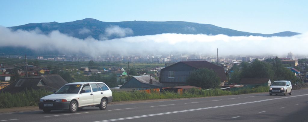 Летняя особенность столицы Колымы: внезапные обложные туманы, наползающие с бухты на город — в тот момент, когда холодный морской воздух встречается с нагретым на суше. В море я все-таки залез, хотя был, конечно, единственным купающимся. Оно оказалось теплее, чем ожидал, примерно 12 —13 градусов.